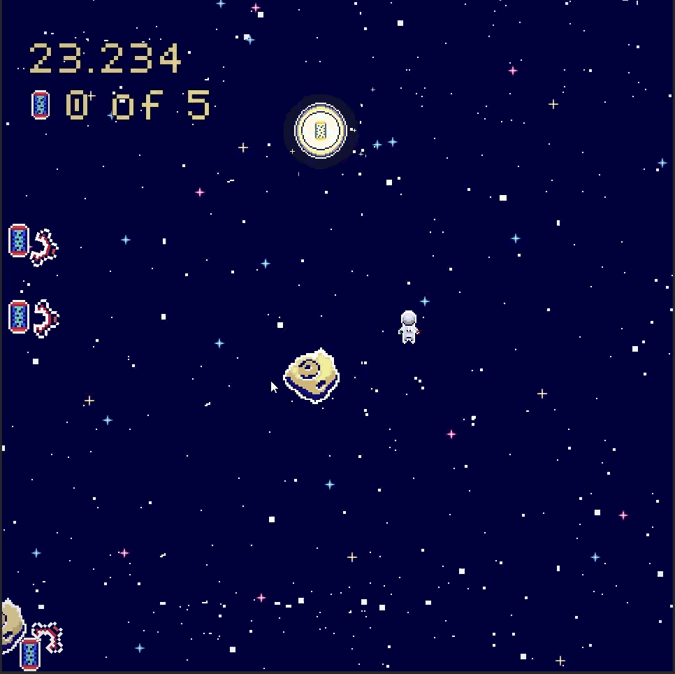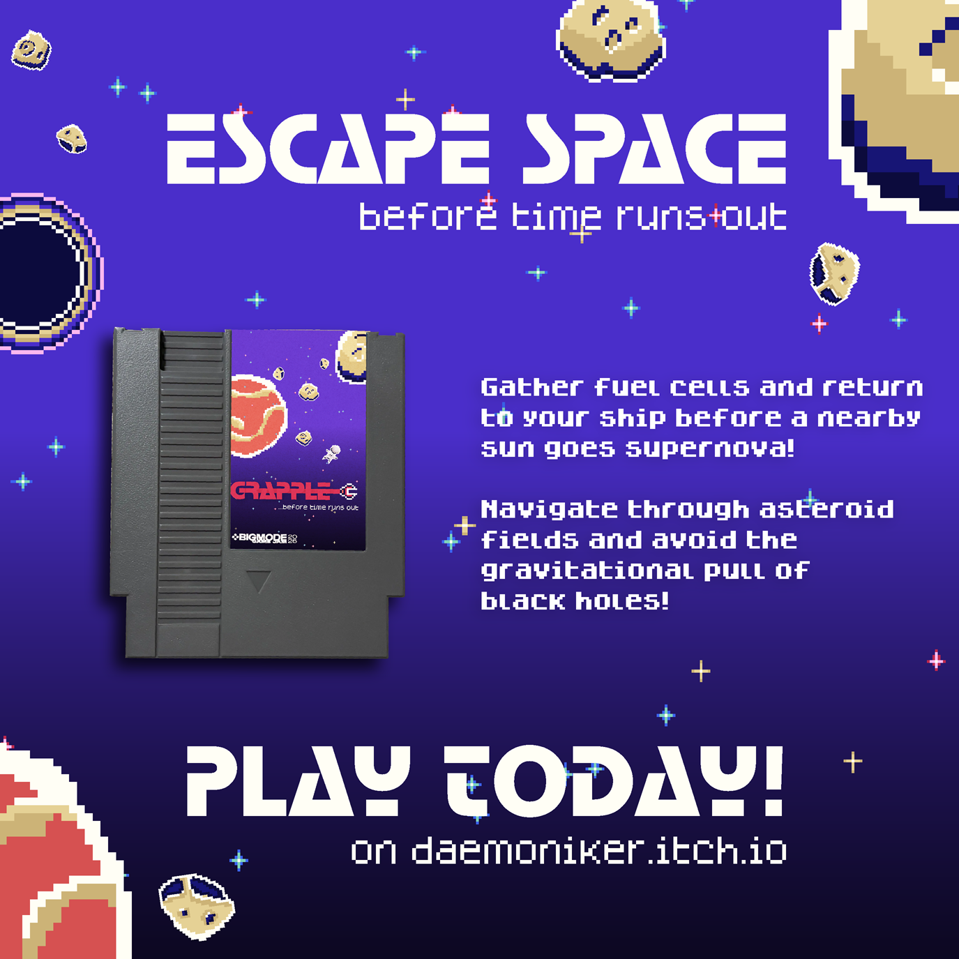 Use your grappling hooks to collect fuel cells from an asteroid field and make it back to your ship before time runs out! Try not to get lost in the endless void or pulled into a blackhole!